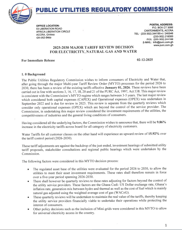 Consumers across Ghana will face higher utility charges beginning January 1, 2026, following the Public Utilities Regulatory Commission’s (PURC) approval of new electricity and water tariffs under its 2026–2030 multi-year review.