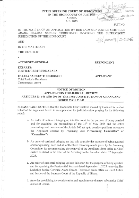 In a suit filed at the High Court, Justice Torkornoo is seeking to invalidate all proceedings of the Justice Gabriel Scott Pwamang Committee, which investigated the allegations that led to her removal from office. She is also challenging the Presidential Warrant that authorized her dismissal, describing it as unconstitutional and of no legal effect.