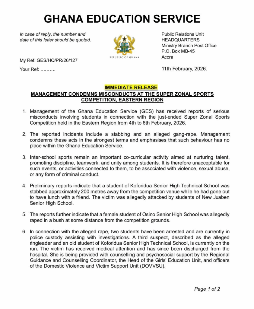 The Ghana Education Service (GES) has strongly condemned two serious incidents involving students during the Super Zonal Sports Competition, held in the Eastern Region from 4 to 6 February 2026.