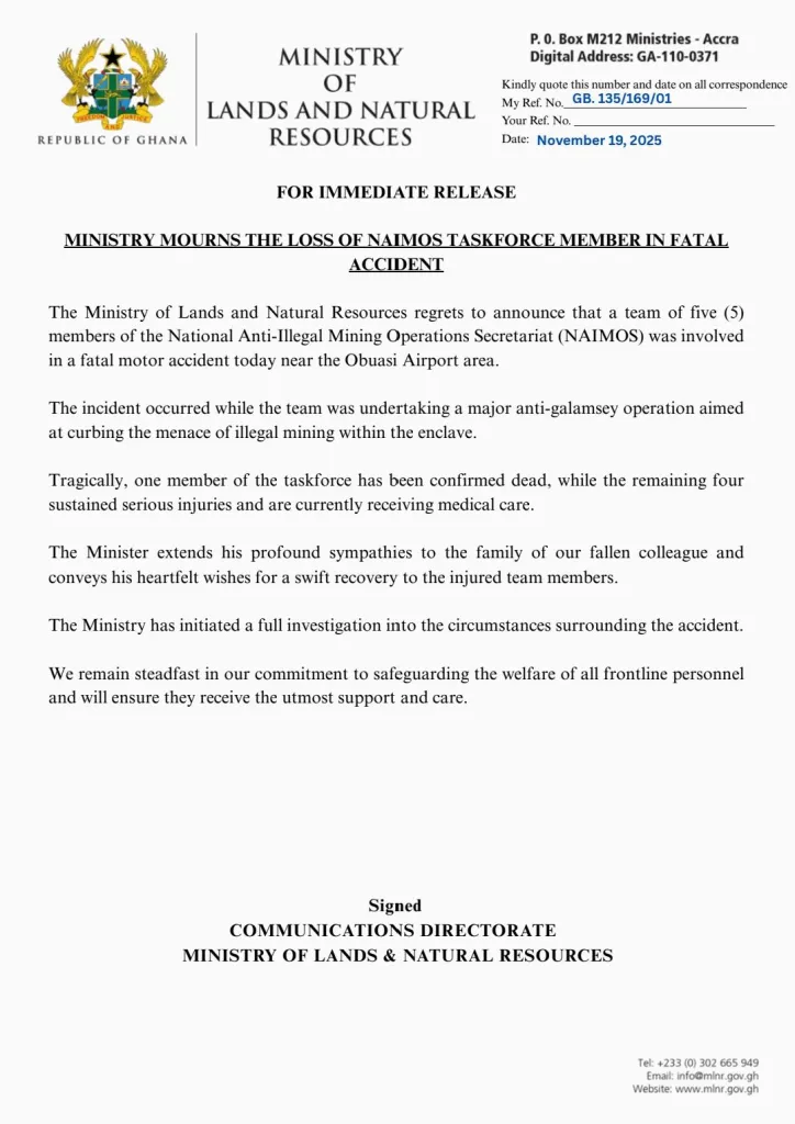 A member of the National Anti-Illegal Mining Operations Secretariat (NAIMOS) taskforce has died following a vehicle crash near the Obuasi Airport area in the Ashanti Region on Wednesday, November 19, 2025.