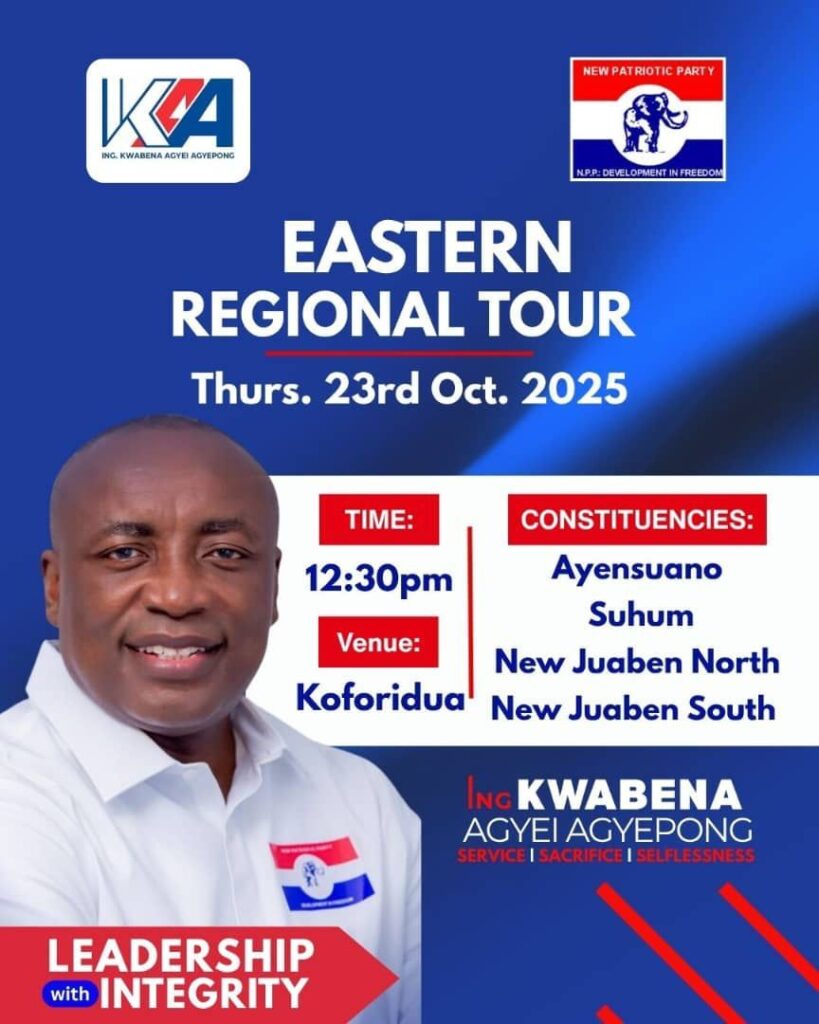 Flagbearer aspirant of the New Patriotic Party (NPP), Ing. Kwabena Agyei Agyepong, is set to begin his Eastern Regional tour on Thursday, October 23, 2025, as he continues to engage party delegates across the country ahead of the January 31, 2026, presidential primaries.