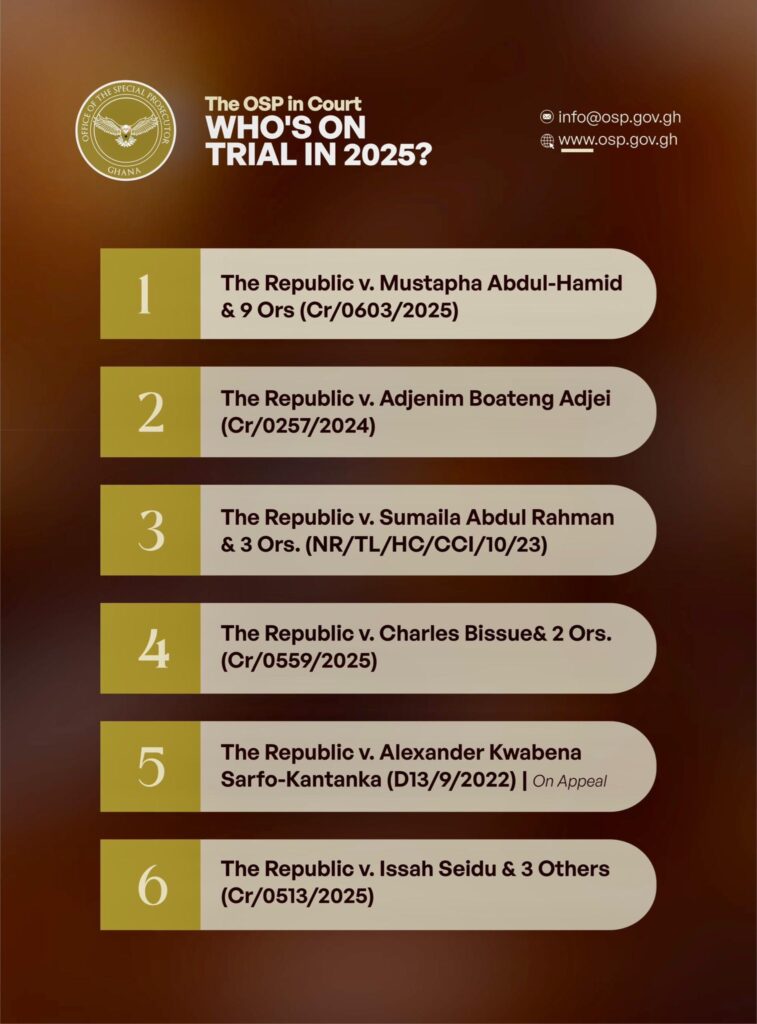 The announcement was made in a statement shared on X (formerly Twitter) on Sunday, October 19, 2025, as courts reopen following their annual judicial recess. The OSP emphasized that its ongoing prosecutions reflect its commitment to tackling corruption on behalf of the Ghanaian public.
